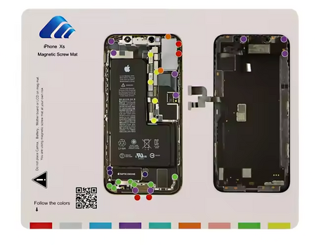 Ce patron élimine ce risque. Il reproduit fidèlement le schéma interne de l'iPhone XS. Chaque emplacement de vis est clairement indiqué. En posant chaque vis retirée sur son emplacement correspondant sur le tapis, vous créez une "carte" physique de votre réparation. Au moment du remontage, vous savez exactement quelle vis va où, sans aucun doute possible.